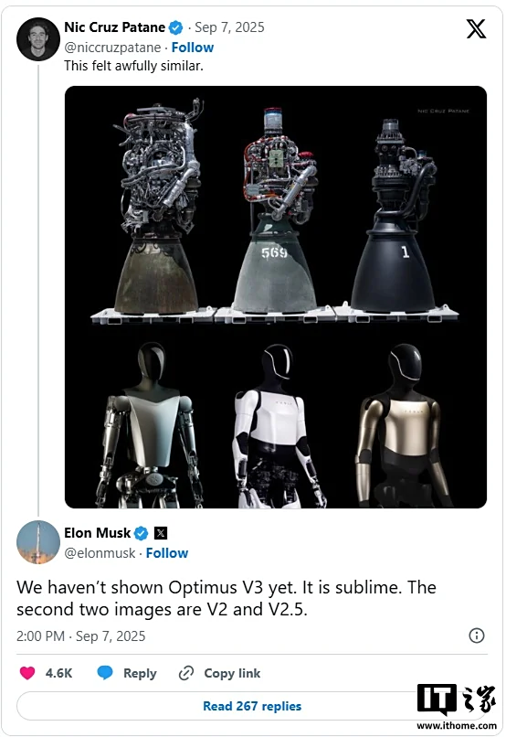 IT之家注意到,有 X 平台用户将 Optimus 的研发进展与“星舰”的 Raptor V1、V2、V3 发动机作对比,马斯克在回复中澄清,特斯拉尚未展示 Optimus V3,并称新图片中的人形机器人实为 Optimus V2.5。他在回复中写道:“我们还没展示过 Optimus V3,这款产品会非常出色。后两张图片分别是 V2 和 V2.5 版本。”